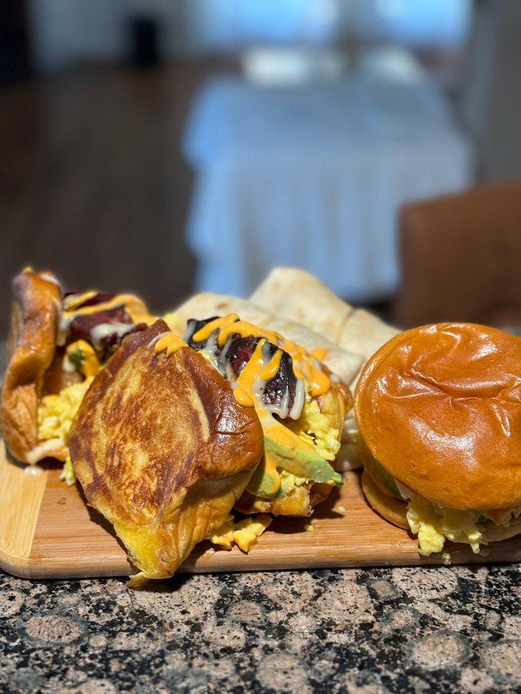 Brioche Toast filled with a Very Soft Cage Free Scrambled Eggs, Swiss Cheese, Avocado, Fresh Chives, House Sriracha Aioli,house Mayo.