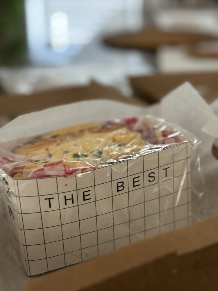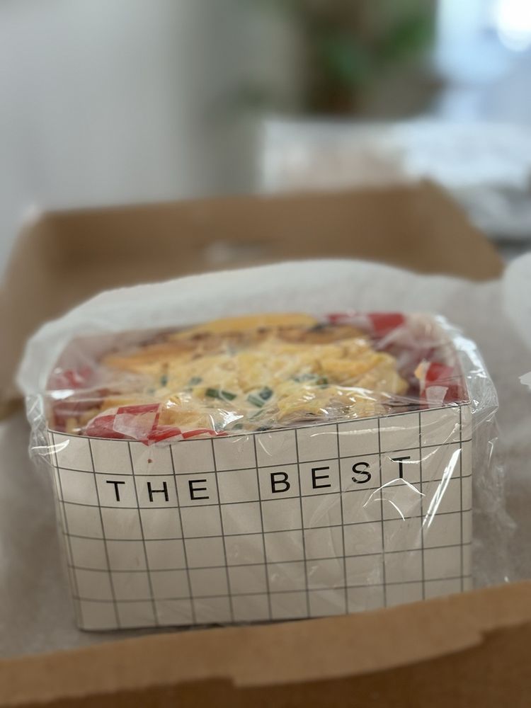 Brioche Toast filled with a Very Soft Cage Free Scrambled Eggs, Smoked Turkey Bacon, Swiss Cheese, Fresh Chives, House Sriracha Aioli,house Mayo.